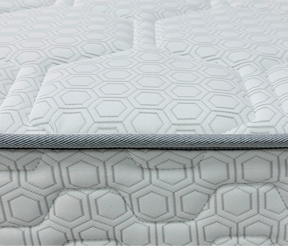 Трикотаж «Carbon» — современный и стильный материал с оригинальным рельефным рисунком «соты», который придаёт матрасу эффектный и премиальный вид. Высокая плотность ткани гарантирует её прочность и долговечность, а эластичная структура обеспечивает идеально ровное прилегание к наполнителю, сохраняя гладкость поверхности на протяжении всего срока службы. Материал обладает хорошей воздухопроницаемостью, что помогает поддерживать комфортный микроклимат во время сна, и устойчив к износу, сохраняя свой внешний вид даже при длительной эксплуатации